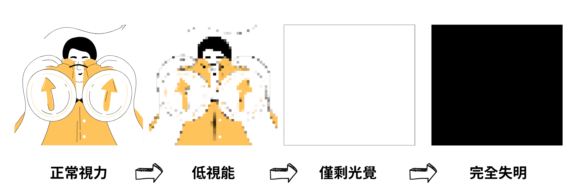 而其實上面的順序,就是從有視力到失去視力的漸進過程(正常視力→低視力→僅剩光覺→完全失明)